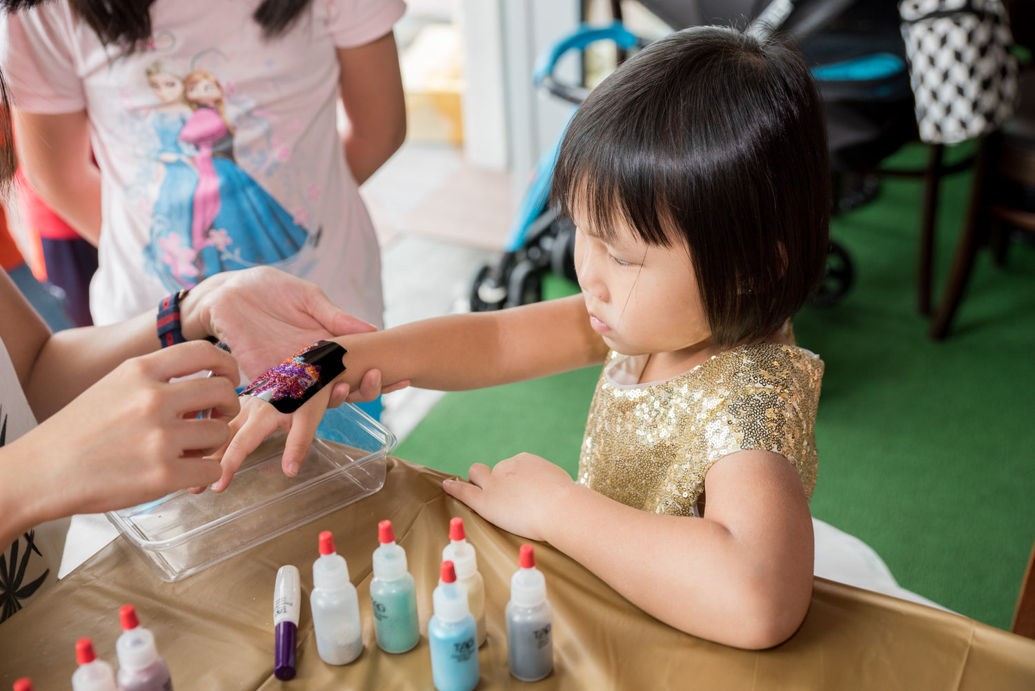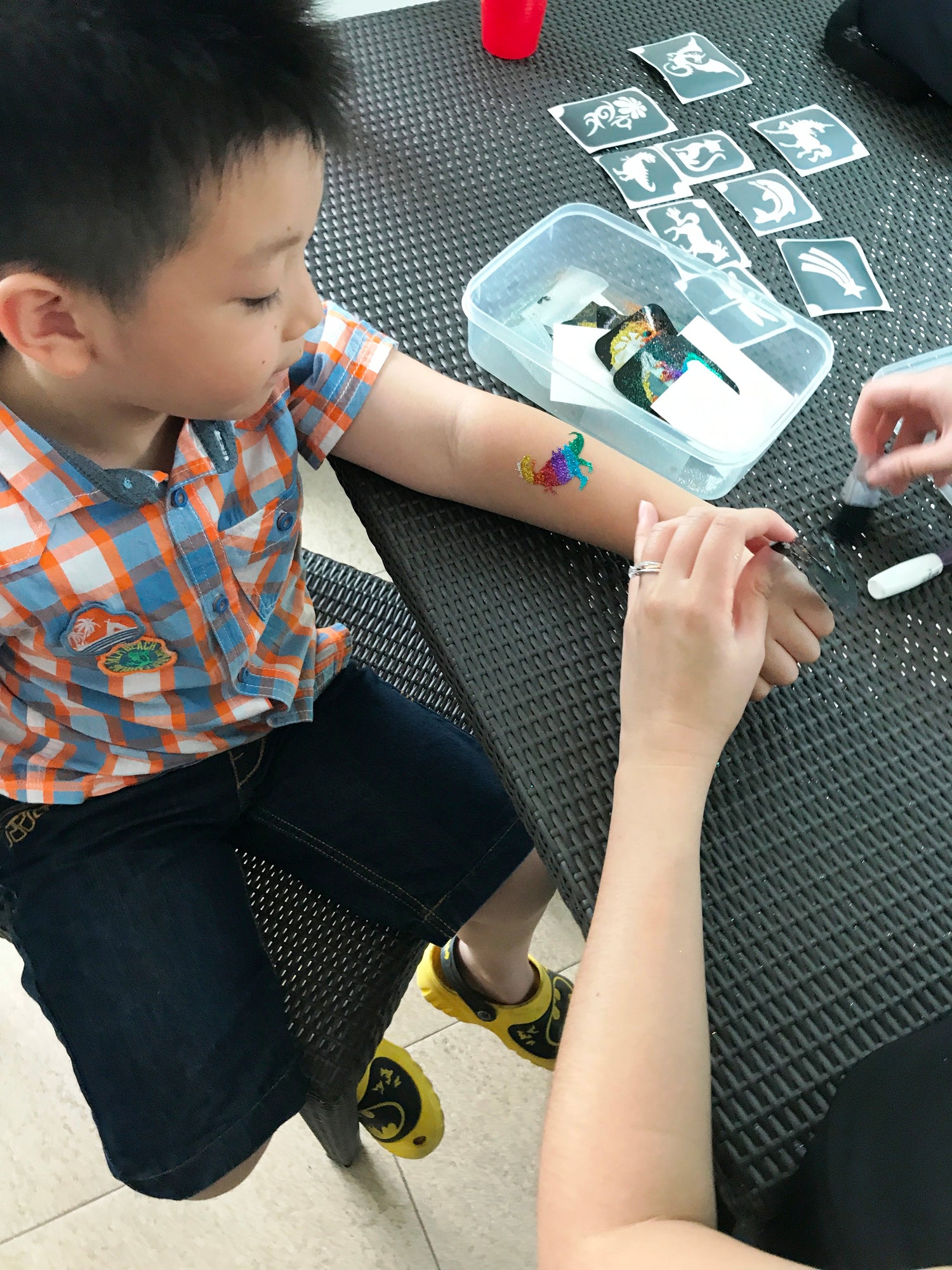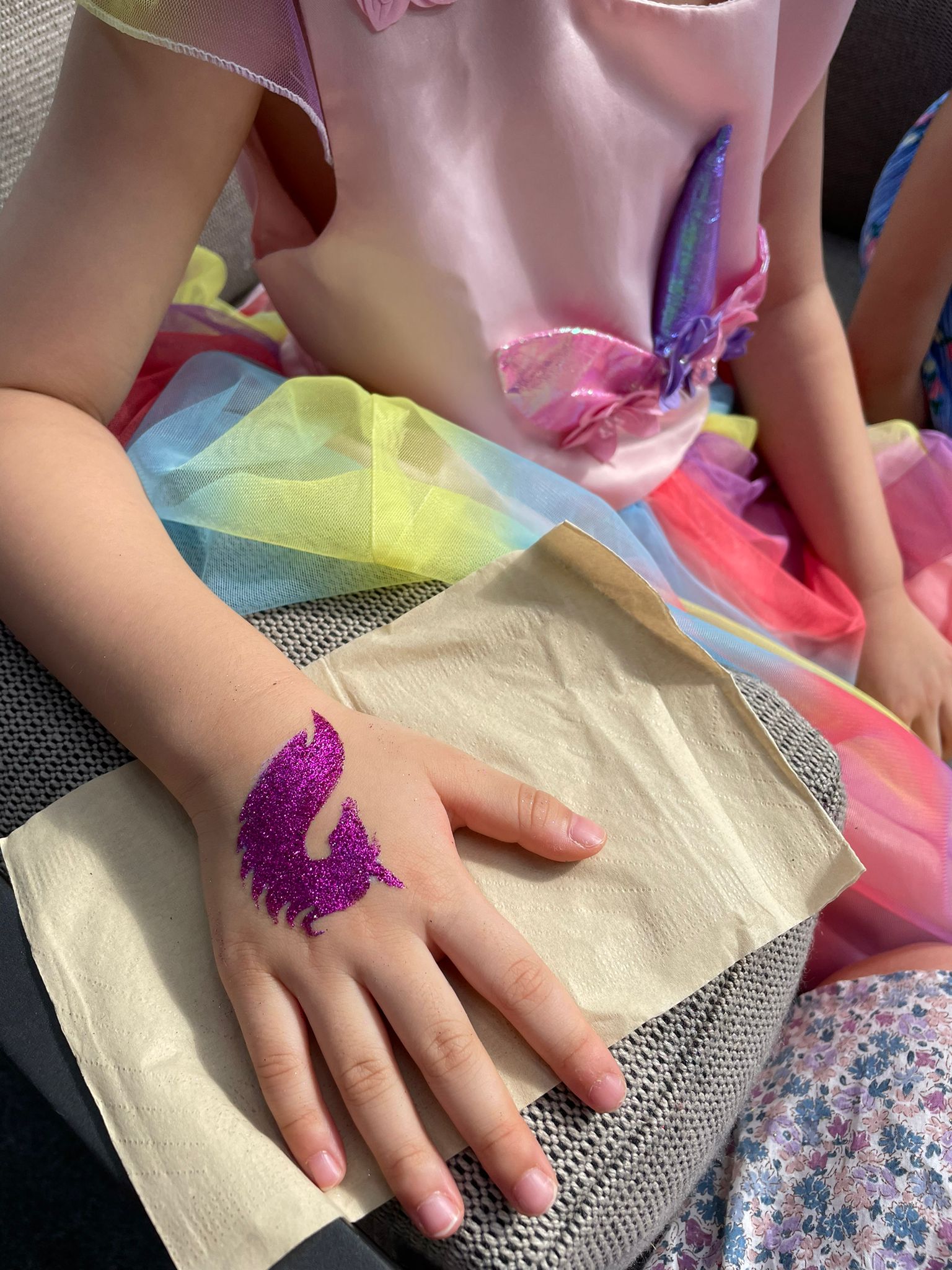 We use only skin-safe, high-quality materials for our glitter tattoos, ensuring a safe and enjoyable experience for children.